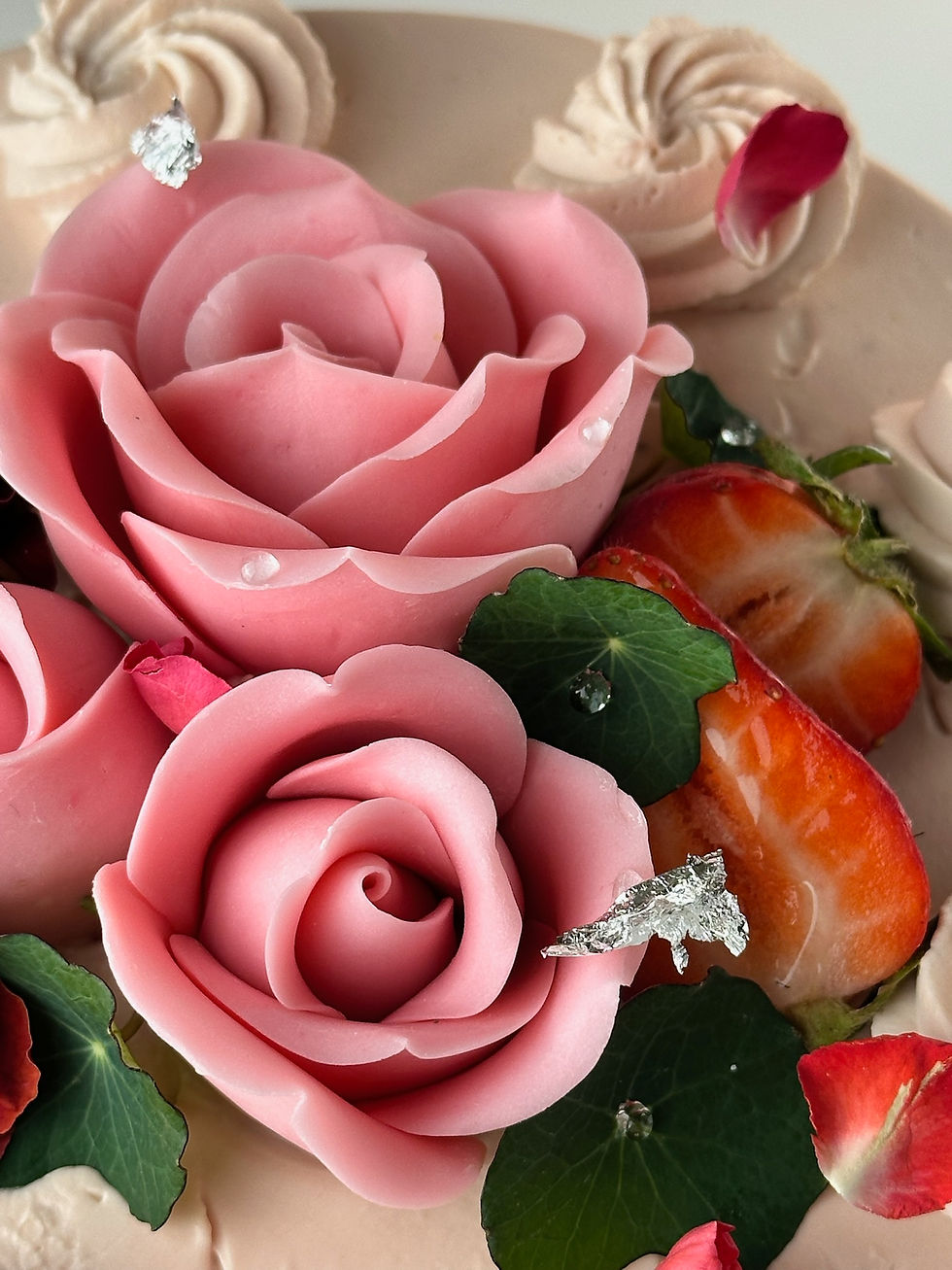 Decorated with delicate, hand crafted chocolate roses, this cake brings both beauty and indulgence to your table.